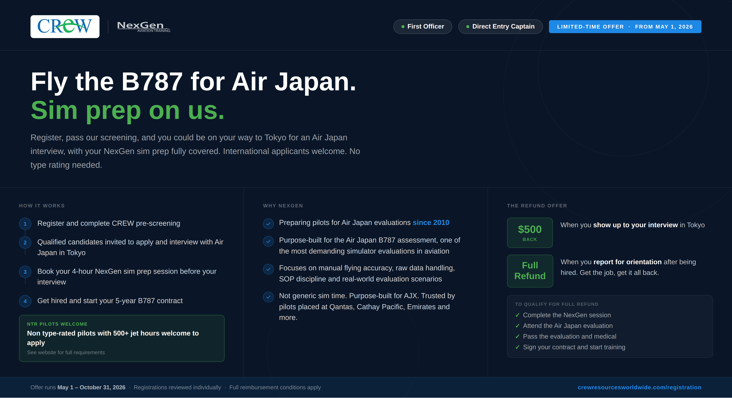 CREW Resources Worldwide is managed by pilots, for pilots. We’re airline professionals who’ve sat the evaluations, flown the line, and navigated the realities of flying in Japan. Our management team is made up entirely of JCAB-qualified pilots, so the guidance you get is practical, honest, and current. CREW also holds an exclusive partnership with NexGen Aviation, the world’s pre-eminent simulator preparation provider, trusted by airline pilots globally and the definitive experts for Air Japan evaluations. If you’re serious about passing and flying the line in Japan, this is the team pilots trust.